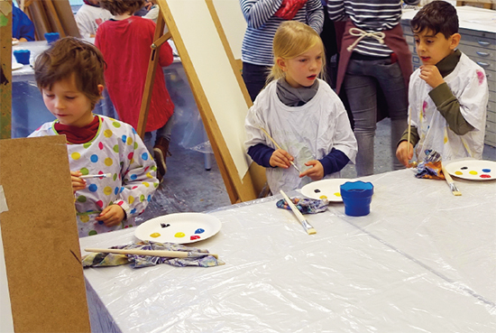 Die Kinder der ersten Gruppe eilen aufgeregt mit Sina und Lisa zum Atelier. Nanu? Was steht denn da vor der Tür? Lara wirft einen Blick in die Kiste, die ihnen den Weg versperrt. »Da drin sind Kittel!«, ruft sie und zupft direkt einen heraus. »Die hat bestimmt Klecks für euch zurechtgelegt, denn er benutzt auch Malhemden«, erklärt Sina. Und so zieht jedes Kind einen Kittel über, bevor sich die Tür zum Atelier öffnet. Einige flitzen gleich zu den im Raum verteilten Staffeleien. »Hier male ich!«, ruft Aurel, während Greta sich bereits einen Pinsel geschnappt hat: »Und hier ich!« Eine Atmosphäre aufgeregter Vorfreude breitet sich aus. Doch zunächst kommen alle wieder zusammen, denn die beiden Kunststudierenden wollen das weitere Vorgehen mit ihnen besprechen.